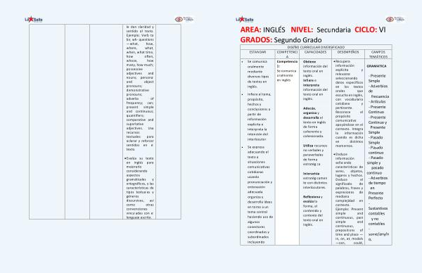 AREA : INGLÉS NIVEL : Secundaria CICLO : VI GRADOS : Segundo Grado DISEÑO CURRICULAR DIVERSIFICADO ESTANDAR COMPETENCI A CAPACIDADES DESEMPEÑOS CAMPOS TEMÁTICOS • Se comunica oralmente mediante diversos tipos de textos en inglés . • Infiere el tema , propósito , hechos y conclusiones a partir de información explícita e interpreta la intención del interlocutor . • Se expresa adecuando el texto a situaciones comunicativas cotidianas usando pronunciación y entonación adecuada ; organiza y desarrolla ideas en torno a un tema central haciendo uso de algunos conectores coordinados y subordinados incluyendo Competencia 1 : Se comunica oralmente en inglés Obtiene información del texto oral en inglés . Infiere e interpreta información del texto oral en inglés . Adecúa , organiza y desarrolla el texto en inglés de forma coherente y cohesionada . Utiliza recursos no verbales y paraverbales de forma estratégica . Interactúa estratégicamen te con distintos interlocutores . Reflexiona y evalúa la forma , el contenido y contexto del texto oral en inglés . • Recupera información explícita y relevante seleccionando datos específicos en los textos orales que escucha en inglés , con vocabulario cotidiano y pertinente . Reconoce el propósito comunicativo apoyándose en el contexto . Integra la información cuando es dicha en distintos momentos . • Deduce información señalando características de seres , objetos , lugares y hechos . Deduce el significado de palabras , frases y expresiones de mediana complejidad en contexto . Ejemplo : Present simple and continuous , past simple and continuous , prepositions of time and place — in , on , at ; modals — can , could , GRAMATICA - Presente Simple - Adverbios de frecuencia - Artículos - Presente Continuo - Presente Continuo y Presente Simple - Pasado Simple - Pasado continuo - Pasado simple y pasado continuo - Adverbios de tiempo en Presente Perfecto - Sustantivos contables y no contables - some / any / n o ,