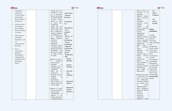 vocabulario cotidiano y construcciones gramaticales determinadas y pertinentes . • Utiliza recursos no verbales y para-verbales para dar énfasis a su texto . • Opina sobre lo escuchado haciendo uso de sus conocimientos del tema . • En un intercambio , participa formulando y respondiendo preguntas sobre actividades diarias should , have to ; connectors and , or , so , because ; future with going to , adverb clauses of time — after , before , as soon as , when ; zero conditional , would like to , want to , like + ing , future with will , first conditional . Deduce , también , el significado de las relaciones lógicas ( adición , contraste , secuencia , semejanzadiferencia , causa y consecuencia ) y jerárquicas ( ideas principales ) de estructura simple en textos orales en inglés . • Explica el tema y el propósito comunicativo . Distingue lo relevante de lo complementario vinculando el texto con su experiencia a partir de recursos verbales , no verbales y paraverbales para construir el sentido del texto oral en inglés . • Adapta el texto oral a la situación comunicativa manteniendo el registro y los modos culturales , y considerando el much / many - Relative Pronouns - Comparativ os y superlativos - “ too / enough + adj ” - Not as …. as - Cero Conditional - Primer Conditional - Segundo Condicional - Tiempo Futuro : Be going to - Will - Verbos Modales - Pasado Perfecto - Gerunds and Infinitive s . - Reported Speech - Reported Speech Question s