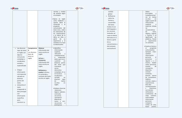 normas y modos de cortesía según el contexto . • Opina en inglés como hablante y oyente sobre el contenido y el propósito comunicativo del texto oral , y sobre las intenciones de los interlocutores y el efecto de lo dicho en ellos a partir de su experiencia y el contexto en el que se desenvuelve . • Lee diversos tipos de texto en inglés con algunas estructuras complejas y vocabulario variado y especializado . • Integra información contrapuesta ubicada en distintas partes del texto . • Interpreta el texto integrando la idea principal con información específica para construir su Competencia 2 : Lee diversos tipos de texto en inglés Obtiene información del texto escrito en inglés Infiere e interpreta información del texto escrito en inglés . Reflexiona y evalúa la forma , el contenido y contexto del texto escrito en inglés . • Identifica información explícita , relevante y complementari a integrando datos que se encuentran en distintas partes del texto que contienen varios elementos complejos en su es-tructura y vocabulario variado , en diversos tipos de textos escritos en inglés . • Deduce diversas relaciones lógicas ( adición , contraste , secuencia , semejanzadiferencia , causa y consecuencia ) y jerárquicas