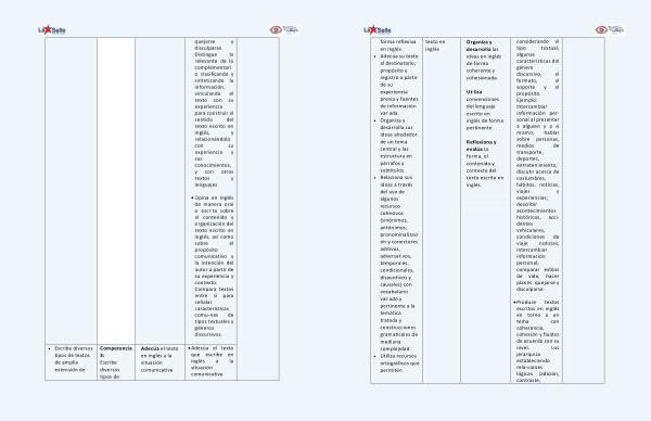 quejarse y disculparse . Distingue lo relevante de lo complementari o clasificando y sintetizando la información , vinculando el texto con su experiencia para construir el sentido del texto escrito en inglés , y relacionándolo con su experiencia y sus conocimientos , y con otros textos y lenguajes . • Opina en inglés de manera oral o escrita sobre el contenido y organización del texto escrito en inglés , así como sobre el propósito comunicativo y la intención del autor a partir de su experiencia y contexto . Compara textos entre sí para señalar características comu-nes de tipos textuales y géneros discursivos . • Escribe diversos tipos de textos de amplia extensión de Competencia 3 : Escribe diversos tipos de Adecúa el texto en inglés a la situación comunicativa . • Adecúa el texto que escribe en inglés a la situación comunicativa