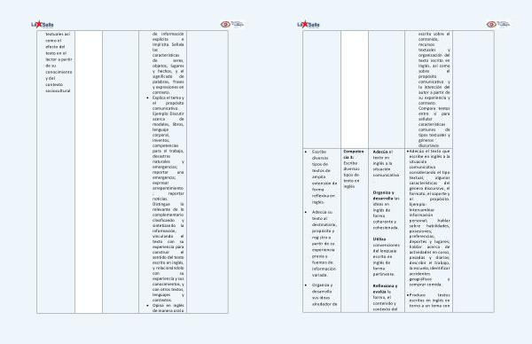 escrita sobre el contenido , recursos textuales y organización del texto escrito en Inglés , así como sobre el propósito comunicativo y la intención del autor a partir de su experiencia y contexto . Compara textos entre sí para señalar características comunes de tipos textuales y géneros discursivos • Escribe diversos tipos de textos de amplia extensión de forma reflexiva en inglés . • Adecúa su texto al destinatario , propósito y registro a partir de su experiencia previa y fuentes de información variada . • Organiza y desarrolla sus ideas alrededor de Competen cia 3 : Escribe diversos tipos de texto en inglés Adecúa el texto en inglés a la situación comunicativa . Organiza y desarrolla las ideas en inglés de forma coherente y cohesionada . Utiliza convenciones del lenguaje escrito en inglés de forma pertinente . Reflexiona y evalúa la forma , el contenido y contexto del • Adecúa el texto que escribe en inglés a la situación comunicativa considerando el tipo textual , algunas características del género discursivo , el formato , el soporte y el propósito . Ejemplo : Intercambiar información personal ; hablar sobre habilidades , posesiones , preferencias , deportes y lugares ; hablar acerca de actividades en curso , pasadas y diarias ; describir el trabajo , la escuela ; identificar accidentes geográficos y comprar comida . • Produce textos escritos en inglés en torno a un tema con