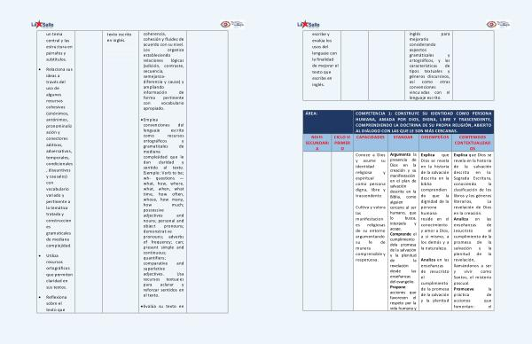 escribe y evalúa los usos del lenguaje con la finalidad de mejorar el texto que escribe en inglés . inglés para mejorarlo considerando aspectos gramáticales y ortográficos , y las características de tipos textuales y géneros discursivos , así como otras convenciones vinculadas con el lenguaje escrito . ÁREA : COMPETENCIA 1 : CONSTRUYE SU IDENTIDAD COMO PERSONA HUMANA , AMADA POR DIOS , DIGNA , LIBRE Y TRASCENDENTE , COMPRENDIENDO LA DOCTRINA DE SU PROPIA RELIGIÓN , ABIERTO AL DIÁLOGO CON LAS QUE LE SON MÁS CERCANAS . NIVEL SECUNDARI A CICLO VI PRIMER O CAPACIDADES STANDAR DESEMPEÑOS CONTENIDOS CONTEXTUALIZAD OS Conoce a Dios y asume su identidad religiosa y espiritual como persona digna , libre y trascendente . Cultiva y valora las manifestacion es religiosas de su entorno argumentando su fe de manera comprensible y respetuosa . Argumenta la presencia de Dios en la creación y su manifestación en el plan de salvación descrita en la Biblia , como alguien cercano al ser humano , que lo busca , interpela y acoge . Comprende el cumplimiento dela promesa de la salvación y la plenitud de la revelación desde las enseñanzas del evangelio . Propone acciones que favorecen el respeto por la vida humana y Explica que Dios se revela en la historia de la salvación descrita en la biblia comprendien do que la dignidad de la persona humana reside en el conocimiento y amor a Dios , a sí mismo , a los demás y a la naturaleza . Analiza en las enseñanzas de Jesucristo el cumplimiento de la promesa de la salvación y la plenitud Explica que Dios se revela en la historia de la salvación descrita en la : Sagrada Escritura , conociendo la clasificación de los libros y los géneros literarios , La revelación de Dios en la creación . Analiza en las enseñanzas de Jesucristo el cumplimiento de la promesa de la salvación y la plenitud de la revelación , llamándonos a ser y vivir como Santos , el misterio pascual . Promueve la práctica de acciones que fomentan : el