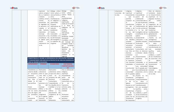 expresen los valores propios de su tradición cristiana y católica , el bien común , la promoción de la dignidad de la persona y el respeto a la vida humana . Interioriza el mensaje de Jesucristo y las enseñanzas de la Iglesia para actuar en coherencia con su fe . dialogo critico entre cultura y ciencia frente a otras manifestacion es religiosas y espirituales . Propone alternativas de solución a problemas locales , nacionales y mundiales a la luz del mensaje del evangelio y la tradición de la Iglesia . dialogo crítico entre cultura y ciencia frente a otras manifestaciones religiosas y espirituales : las sectas en el mundo y el Perú , las religiones en el mundo . Propone alternativas de solución a problemas locales , nacionales y mundiales a la luz del mensaje del evangelio : frente a las corrientes filosóficas , la doctrina de la nueva era , el humanismo cristiano y su vigencia COMPETENCIA 2 : ASUME LA EXPERIENCIA DEL ENCUENTRO PERSONAL Y COMUNITARIO CON DIOS EN SU PROYECTO DE VIDA EN COHERENCIA CON SU CREENCIA RELIGIOSA . CAPACIDADES STANDAR DESEMPEÑOS CONTENIDOS CONTEXTUALIZAD OS Transforma su entorno desde el encuentro personal y comunitario con Dios y desde la fe que profesa . Actúa coherenteme nte en razón de su fe según los principios de su conciencia moral en Demuestra coherencia entre lo que cree , dice y hace en su proyecto de vida personal , a la luz del mensaje bíblico y los documentos del magisterio de la iglesia . Vivencia su dimensión Demuestra coherencia entre lo que cree , dice y hace en su proyecto de vida personal y comunitaria respondiendo a los desafíos de la realidad a la luz del mensaje bíblico y los documentos del magisterio de la Iglesia . Vive su dimensión Vive su dimensión religiosa , espiritual y trascendente a partir de la celebración comunitaria de su fe : en la Cuaresma , la semana santa , el adviento y la navidad . Promueve el encuentro personal y comunitario con