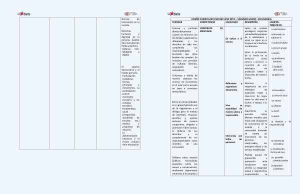 DISEÑO CURRICULAR DIVERSIFICADO DPCC – SEGUNDO GRADO - SECUNDARIA STANDAR COMPETENCIA CAPACIDAD DESEMPEÑO CAMPOS TEMÁTICOS Convive y participa democráticamente cuando se relaciona con los demás respetando las diferencias y los derechos de cada uno , cumpliendo sus responsabilidades y buscando que otros también las cumplan . Se relaciona con personas de culturas distintas , respetando sus costumbres . Construye y evalúa de manera colectiva las normas de convivencia en el aula y en la escuela en base a principios democráticos . Ejerce el rol de mediador en su grupo haciendo uso de la negociación y el diálogo para el manejo de conflictos . Propone , planifica y ejecuta acciones de manera cooperativa , dirigidas a promover el bien común , la defensa de sus derechos y el cumplimiento de sus responsabilidades como miembro de una comunidad . Delibera sobre asuntos públicos formulando preguntas sobre sus causas y consecuencias , analizando argumentos contrarios a los propios y CONSTRUYE SU IDENTIDAD Se valora a sí mismo . Reflexiona y argumenta éticamente . Vive su sexualidad de manera plena y responsable . Interactúa con todas las personas . Explica los cambios psicológicos , corporales y de autoestima propios de la adolescencia y valora sus logros en la búsqueda de la libertad y la autonomía . Valora la participación de su familia en su formación como persona y reconoce la necesidad de usar estrategias de protección frente a situaciones de violencia familiar . Reconoce la importancia de usar estrategias de protección frente a situaciones de riesgo , como las adicciones al alcohol , el tabaco y las drogas . Argumenta su posición sobre dilemas morales que involucran situaciones de convivencia en la escuela y la comunidad tomando en cuenta las intenciones de las personas involucradas , los principios éticos y las normas establecidas . Plantea pautas de prevención y protección ante situaciones que afecten su integridad sexual y reproductiva reconociendo la La adolescencia La libertad y la autonomía El auto concepto La presión grupal La familia Los problemas familiares El cuidado de la salud Las adicciones La convivencia La cohesión social Los valores La reflexión La razón La moral La libertad y la responsabilidad Las normas de convivencia La Constitución Política del Perú Las garantías constitucionales La seguridad ciudadana