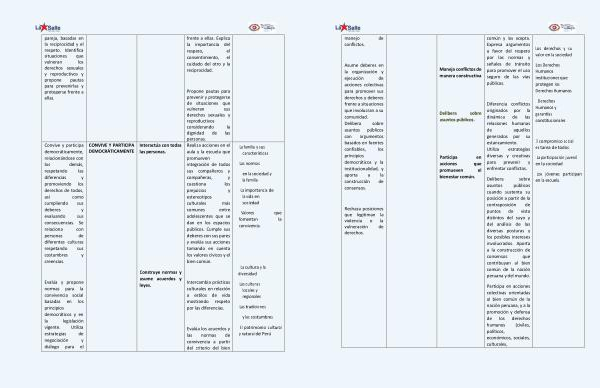 pareja , basadas en la reciprocidad y el respeto . Identifica situaciones que vulneran los derechos sexuales y reproductivos y propone pautas para prevenirlas y protegerse frente a ellas . frente a ellas . Explica la importancia del respeto , el consentimiento , el cuidado del otro y la reciprocidad . Propone pautas para prevenir y protegerse de situaciones que vulneran sus derechos sexuales y reproductivos considerando la dignidad de las personas . Convive y participa democráticamente , relacionándose con los demás , respetando las diferencias y promoviendo los derechos de todos , así como cumpliendo sus deberes y evaluando sus consecuencias . Se relaciona con personas de diferentes culturas respetando sus costumbres y creencias . Evalúa y propone normas para la convivencia social basadas en los principios democráticos y en la legislación vigente . Utiliza estrategias de negociación y diálogo para el CONVIVE Y PARTICIPA DEMOCRÁTICAMENTE Interactúa con todas las personas . Construye normas y asume acuerdos y leyes . Realiza acciones en el aula y la escuela que promueven integración de todos sus compañeros y compañeras , y cuestiona los prejuicios y estereotipos culturales más comunes entre adolescentes que se dan en los espacios públicos . Cumple sus deberes con sus pares y evalúa sus acciones tomando en cuenta los valores cívicos y el bien común . Intercambia prácticas culturales en relación a estilos de vida mostrando respeto por las diferencias . Evalúa los acuerdos y las normas de convivencia a partir del criterio del bien La familia y sus características Las normas en la sociedad y la familia La importancia de la vida en sociedad Valores que fomentan la convivencia La cultura y la diversidad Las culturas locales y regionales Las tradiciones y las costumbres El patrimonio cultural y natural del Perú