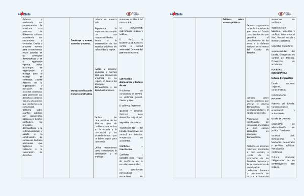 Delibera sobre asuntos públicos . Expresa argumentos sobre la importancia que tiene el Estado como institución que garantiza el cumplimiento de las leyes y la defensa nacional en el marco del Estado de derecho . Delibera sobre asuntos públicos que afectan el sistema democrático , la institucionalidad y el estado de derecho . * Promueve la construcción de consensos orientados al bien común basándose en principios democráticos . Participa en acciones colectivas orientadas al bien común , a través de la promoción de los derechos humanos y de los mecanismos de participación ciudadana . Sustenta la pertinencia de recurrir a instancias resolución de conflictos . Reconciliación Nacional . Violencia y conflicto interno en el Perú . Verdad , justicia y memoria colectiva . Seguridad ciudadana : responsabilidad del Estado . Dispositivos de control de tránsito . Prevención de accidentes . SOCIEDAD DEMOCRÁTICA Sistema Democrático Estado peruano : Orígenes , características . Constituciones peruanas . Poderes del Estado . Funcionamiento , organización y atribuciones . Estado de Derecho . Organismos de administración de justicia . Funciones . Sociedad Civil . Instituciones y funciones . Democracia y partidos políticos . Participación ciudadana . Cultura tributaria : Obligaciones de los contribuyentes con negocio .