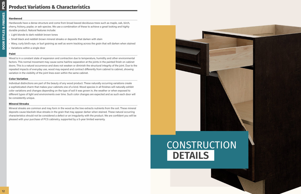 Mineral Streaks Mineral streaks are common and may form in the wood as the tree extracts nutrients from the soil. These mineral deposits cause blackish-blue streaks in the grain that may appear darker when stained. These natural occurring characteristics should not be considered a defect or an irregularity with the product. We are confident you will be pleased with your purchase of PCS cabinetry, supported by a 5-year limited warranty.