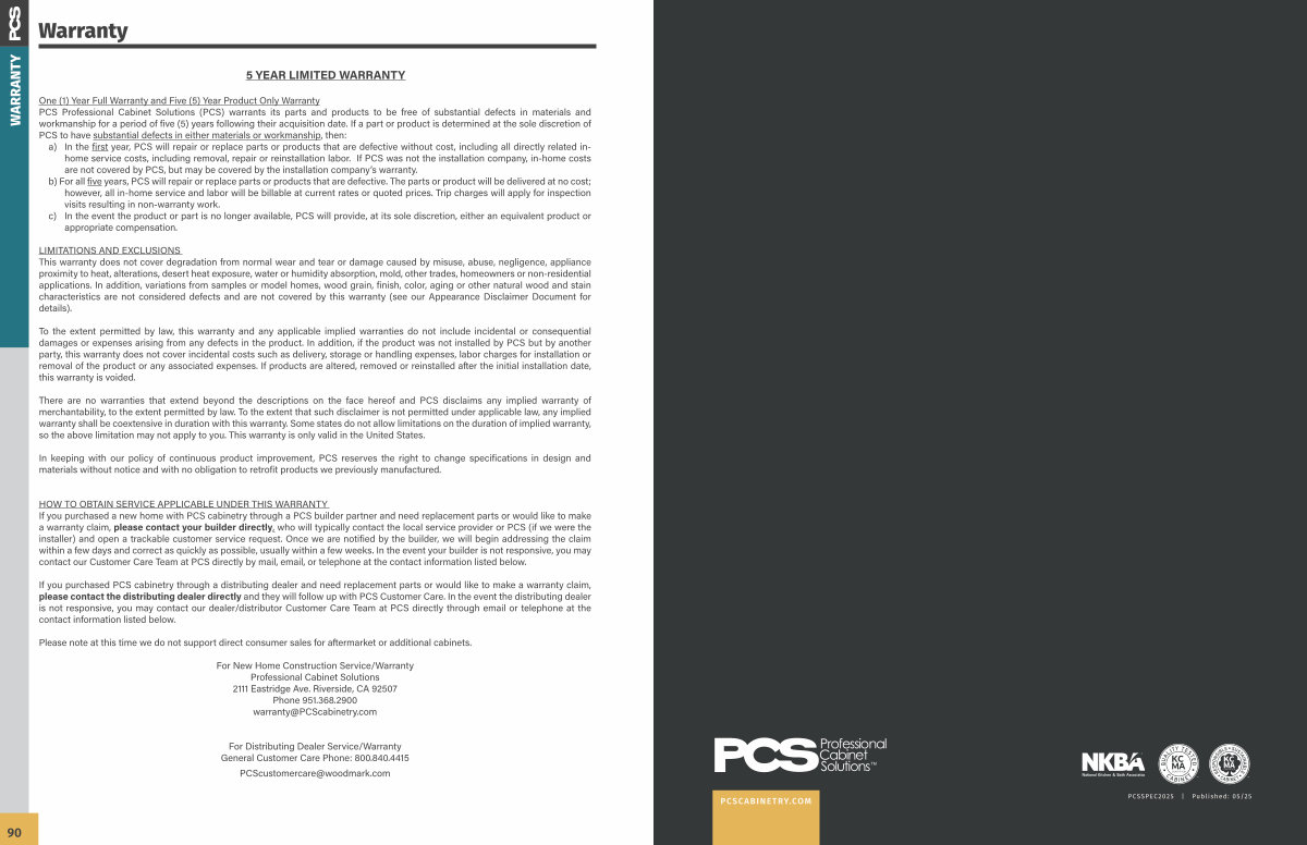 One( 1) Year Full Warranty and Five( 5) Year Product Only Warranty PCS Professional Cabinet Solutions( PCS) warrants its parts and products to be free of substantial defects in materials and workmanship for a period of five( 5) years following their acquisition date. If a part or product is determined at the sole discretion of PCS to have substantial defects in either materials or workmanship, then: a) In the first year, PCS will repair or replace parts or products that are defective without cost, including all directly related inhome service costs, including removal, repair or reinstallation labor. If PCS was not the installation company, in-home costs are not covered by PCS, but may be covered by the installation company’ s warranty. b) For all five years, PCS will repair or replace parts or products that are defective. The parts or product will be delivered at no cost; however, all in-home service and labor will be billable at current rates or quoted prices. Trip charges will apply for inspection visits resulting in non-warranty work. c) In the event the product or part is no longer available, PCS will provide, at its sole discretion, either an equivalent product or appropriate compensation.