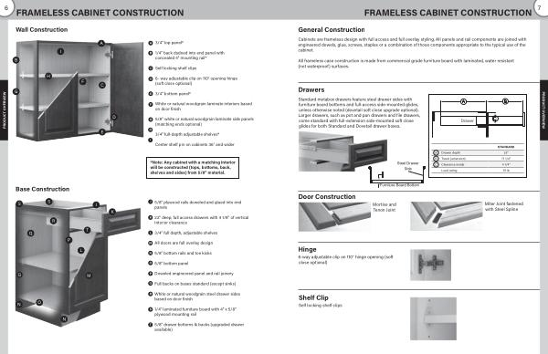 Cabinets are frameless design with full access and full overlay styling . All panels and rail components are joined with engineered dowels , glue , screws , staples or a combination of those components appropriate to the typical use of the cabinet .