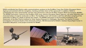 NASA contributed two Electra radio communications systems to the ExoMars Trace Gas Orbiter ( European Space Agency ) and assisted with the navigation , tracking and data return of the spacecraft . In addition , NASA is contributing the mass spectrometer and the main electronics units for the Mars Organic Molecule Analyzer ( MOMA ). The MOMA instrument , central to the ExoMars 2020 rover mission ( European Space Agency ), will allow detection and characterization of organic molecules on Mars . The ExoMars rover will include a drill that will allow sampling of the subsurface of Mars to a depth of almost two meters . The MOMA instrument is led Principal Investigator Fred Goesmann of the Max Planck Institute for Solar System Research in Göttingen , Germany . The Deputy Principal Investigator is Francois Raulin of the University of Paris . Will Brinckerhoff of NASA ' s Goddard Spaceflight Center in Greenbelt , Maryland , is the project scientist for MOMA .