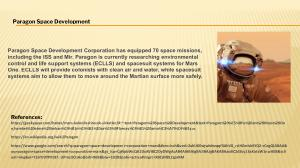 Paragon Space Development Corporation has equipped 70 space missions , including the ISS and Mir . Paragon is currently researching environmental control and life support systems ( ECLLS ) and spacesuit systems for Mars One . ECLLS will provide colonists with clean air and water , while spacesuit systems aim to allow them to move around the Martian surface more safely .