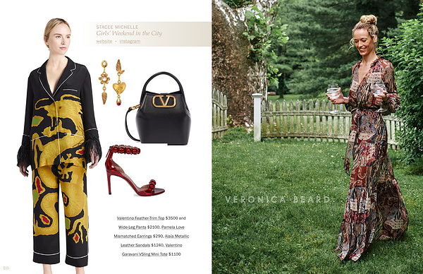 Feather-Trim Top $ 3500 and Wide-Leg Pants $ 2100 , Pamela Love Mismatched Earrings $ 290 , Alaïa Metallic Leather Sandals $ 1240 , Valentino Garavani VSling Mini Tote $ 1100