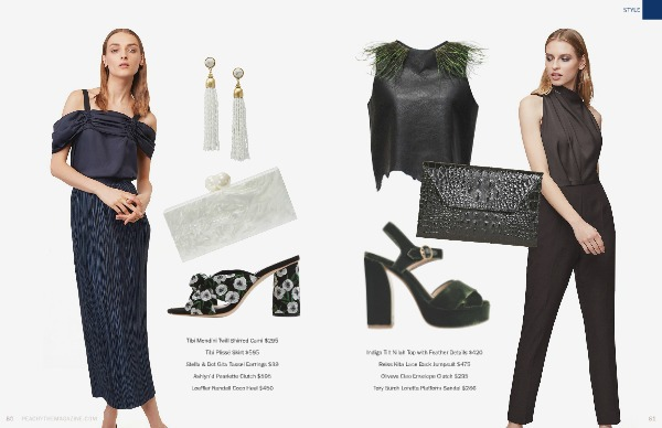 Tibi Mendini Twill Shirred Cami $295 Tibi Plissé Skirt $595 Stella & Dot Gita Tassel Earrings $39 Ashlyn’d Pearlette Clutch $595 Loeffler Randall Coco Heel $450 80 PEACHYTHEMAGAZINE.COM