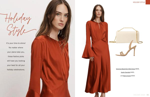 Veronica Beard Ezri Midi Dress $ 848, Austin Sandals $ 495, and Barre Clutch $ 550