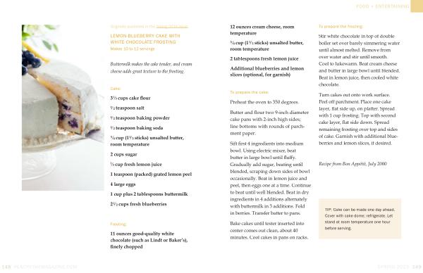 Turn cakes out onto work surface . Peel off parchment . Place one cake layer , flat side up , on platter . Spread with 1 cup frosting . Top with second cake layer , flat side down . Spread remaining frosting over top and sides of cake . Garnish with additional blueberries and lemon slices , if desired .