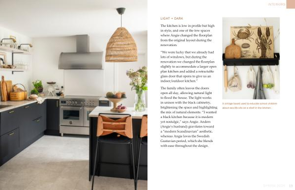 The family often leaves the doors open all day, allowing natural light to flood the house. The light works in unison with the black cabinetry, brightening the space and highlighting the mix of natural elements.“ I wanted a black kitchen because it is modern yet nostalgic,” says Angie. Anders( Angie’ s husband) gravitates toward a“ modern Scandinavian” aesthetic, whereas Angie loves the Swedish Gustavian period, which she blends with ease throughout the design.
