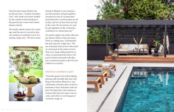 The family added a pool a few years ago, and the area is covered so they can continue to entertain even if it is raining, Angie says,“ We have many friends in Båstad, so our summers are full of parties and get-togethers. Swedes have lots of vacation time from their jobs, so most people are off in July, and we can have fun any day of the week. We do not have to wait for get-togethers on the weekends— sometimes we cannot keep up!”
