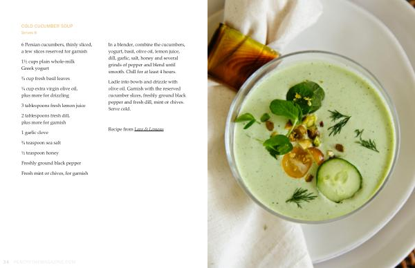 Ladle into bowls and drizzle with olive oil. Garnish with the reserved cucumber slices, freshly ground black pepper and fresh dill, mint or chives. Serve cold.