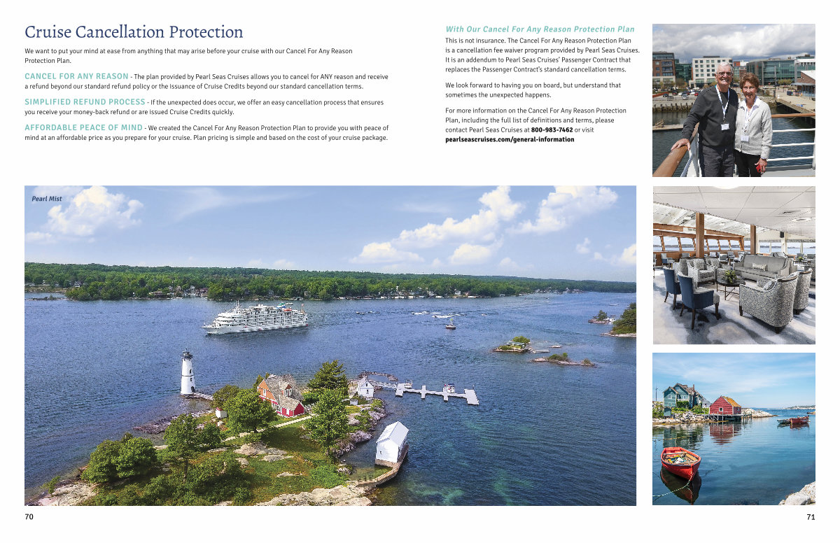 CANCEL FOR ANY REASON- The plan provided by Pearl Seas Cruises allows you to cancel for ANY reason and receive a refund beyond our standard refund policy or the issuance of Cruise Credits beyond our standard cancellation terms.