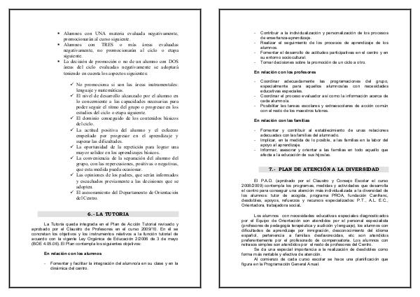 El P. A. D.( aprobado por el Claustro y Consejo Escolar el curso 2008 / 2009) contempla los programas, medidas y actividades que desarrolla el centro para conseguir una atención más individualizada a la diversidad de los alumnos: tutor de acogida, programa PROA, fundación Canfranc, desdobles, apoyos, refuerzos y recursos especializados: P. T., A. L. E. C., Orientadora, trabajadora social.