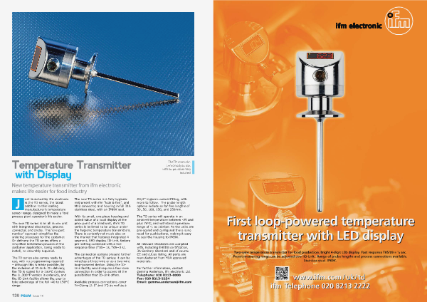 Two-wire temperature transmitter for food production. Bright 4-digit LED display. Fast response T05/09 = sec.