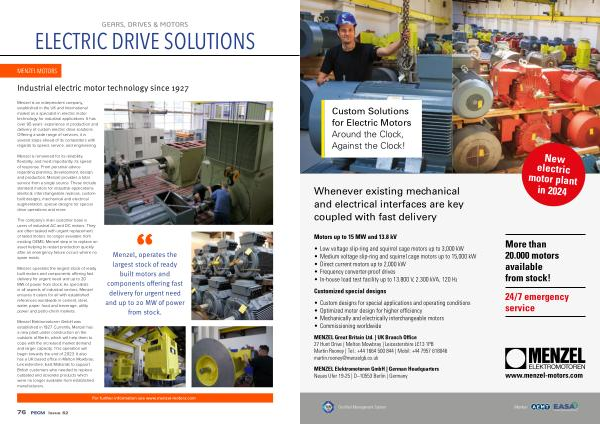 Menzel , operates the largest stock of ready built motors and components offering fast delivery for urgent need and up to 20 MW of power from stock . As specialists in all aspects of industrial sectors , Menzel ensures it caters for all with established references worldwide in cement , steel , water , paper , food and beverage , utility power and petro-chem markets .