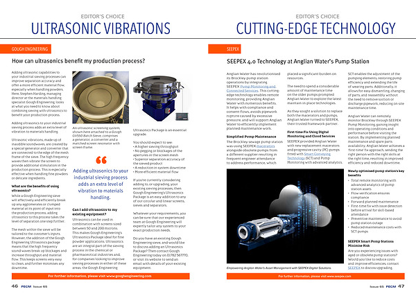 Ultrasonics can be used in combination with screens sized between 50 and 200 microns . This makes Gough Engineering ’ s Ultrasonics Package ideal for fine powder applications . Ultrasonics are an integral part of the sieving process in the chemical or pharmaceutical industries and , for companies looking to improve sieving processes in either of these areas , the Gough Engineering