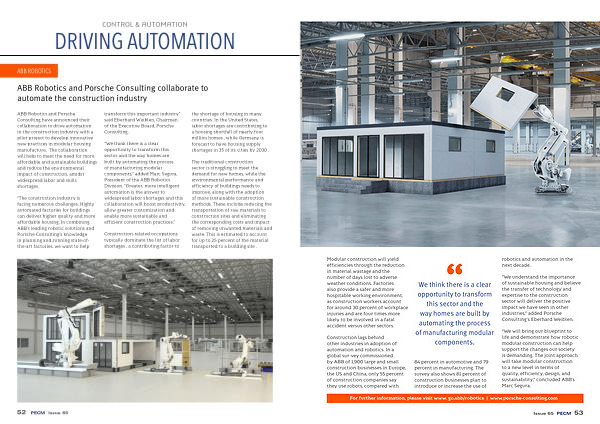 ABB Robotics and Porsche Consulting have announced their collaboration to drive automation in the construction industry with a pilot project to develop innovative new practices in modular housing manufacture . The collaboration will help to meet the need for more affordable and sustainable buildings and reduce the environmental impact of construction , amidst widespread labor and skills shortages .