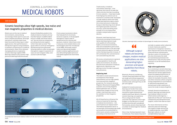 Traditionally , in medical instruments , bearings — that optimise the rotation of axes like robot arms by limiting or avoiding friction and jolts — have been made from high purity metals such as martensitic stainless steel . Examples include medical robots that help undertake keyhole surgery where the utmost precision is required . Surgical robot bearings must deliver the highest possible rotational accuracy , while also being small enough to fit into these often compact and portable hospital devices .