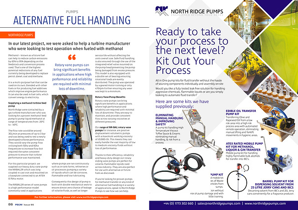 If you ’ re looking for proven pumps for methanol transfer or any kind of alternative fuel handling in a variety of applications , speak to North Ridge Pumps to see how we can help .