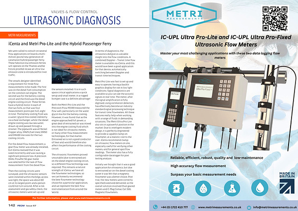 Metri Pro-Lite was fast to set up and easy to operate , having a backlit graphics display for use in low light conditions . Signal diagnostics are available so you can see the acoustic signals in real time . The meter , after the signal amplification is fully digitised , using correlation detection , has effectively become an industry standard signal processing technique for transit-time flowmeters . All these features really help when working with a range of fluids in demanding situations . The Metri Ultra Pro-Lite also sits in a powerful position in the market . Due to intelligent modern design , it is perfectly engineered to provide a capable clamp-on flowmeter , at a realistic cost to the user . iCenta recommend clampon ultrasonic flow meters on site , especially useful for verifying other meters , and for general spot flow readings . The meter also has a fully configurable datalogger for post testing analysis .