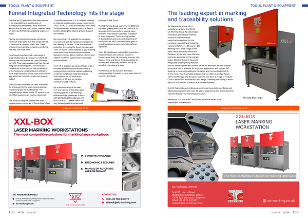 SIC Marking UK is one of 10 subsidiaries around the World . SIC Marking Group has developed innovative , permanent marking solutions and automated identification systems for the complete traceability of industrial components for over 30 years . SIC Marking has a wide range of the most robust and state of the art Dotpeen , Scribe and Laser Marking machines available on the market today . Whether Column Mounted , Integrated or completely Portable like our battery powered cordless eMark for example , we can provide a machine that is suitable for both your application and budget . SIC Marking is constantly adding to the range and re-investing into R & D . The new eTouch portable Dotpeen marker offers Icon style Touch screen technology and the Laser systems now have a range of modular Class 1 enclosures with the XXL-Box range – offering the ability to mark parts up to 1500mm in length as a standard product .