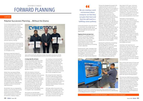 frameworks designed by people who understand the ins and outs of our industry can help our future leaders to define and steer their career pathway . Another sideline benefit is we are empowering future mentors .” Industry trainer and one of the masterminds behind the winning 2023 Plastic Industry Awards training & development program , Darren Vater-Hutchison concurs . Having delivered courses to over 700 industry colleagues at Sumitomo ( SHI ) Demag ’ s IOM3-accredited Academy , Darren expands : “ High quality industry training can help to address the lack of curriculum investment and provides a more direct and immediate solution to local and national skills shortages . Machines make parts . However , knowledge creates value . This value increases markedly as knowledge moves up the scale . Most importantly , this accumulative knowledge is being passed onto to future leaders .”
