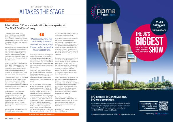 Scott McKenna, Chief Operating Officer for Automate UK, said:“ When registrations for the PPMA Total Show ® opened last month, we promised visitors access to unique expert-led seminars, and we are thrilled to have secured Priya to deliver the first keynote address at the event.