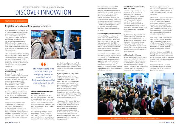 Advanced Engineering also sees the return of Atlas Copco as sponsor of the Automotive & Aerospace Networking Lounge. A standout feature from last year’ s show, the lounge will again host demonstrations and discussions around Smart Factory transformation, covering automation, vision inspection, datadriven analysis and sustainable production.