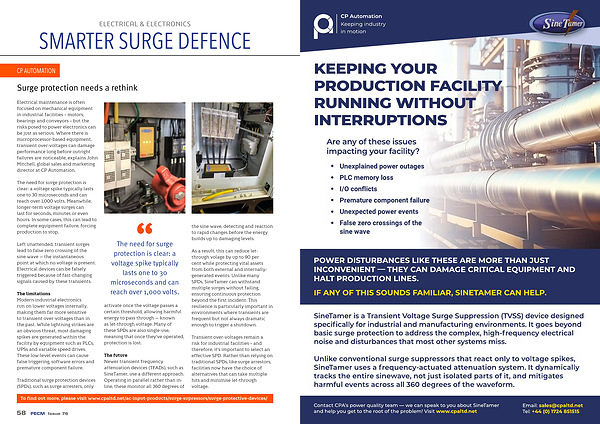 Electrical maintenance is often focused on mechanical equipment in industrial facilities – motors, bearings and conveyors – but the risks posed to power electronics can be just as serious. Where there is microprocessor-based equipment, transient over-voltages can damage performance long before outright failures are noticeable, explains John Mitchell, global sales and marketing director at CP Automation.