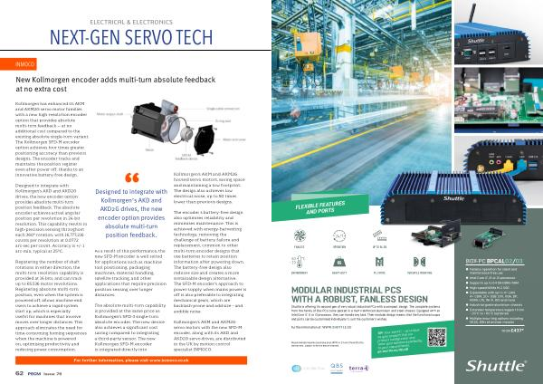 Kollmorgen’ s AKM and AKM2G servo motors with the new SFD-M encoder, along with its AKD and AKD2G servo drives, are distributed in the UK by motion control specialist INMOCO.