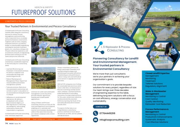 LS Wastewater & Process Consulting Limited offers bespoke consultancy services for Water Process management and monitoring, with a long-term focus on energy and environmental conservation. Together with its sister company, Leachate Solutions: an industryleader in closed landfill engineering and bespoke leachate treatment plants, our consultancy brings over 35 years industrial experience, and an extensive network of engineering professionals working across the water and process industries.