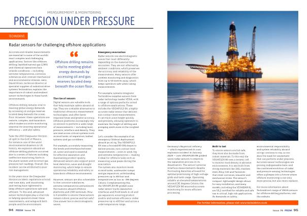 Built to last To ensure sensors are fail-safe, they must also be made from robust materials. To this end, the VEGAFLEX 86 uses a ceramic cell to monitor mud density in abrasive environments. It is also built from strong materials like 316L stainless steel, Alloy C22 and Tantalum that resist corrosion, seawater and mechanical stress. The sensor’ s compact, lightweight design allows for easy installation, and many models, including the VEGABAR 81, are SIL2-certified for reliable and safe use in critical, high-risk applications. As demands on safety, environmental responsibility and system reliability aboard oil rigs continue to rise, so too does the need for equipment that can perform under pressure. Accurate sensor technologies are proving indispensable here, and the continued evolution of radar and pressure sensing technologies offers a glimpse into a future where offshore monitoring is not only more precise, but also more resilient.