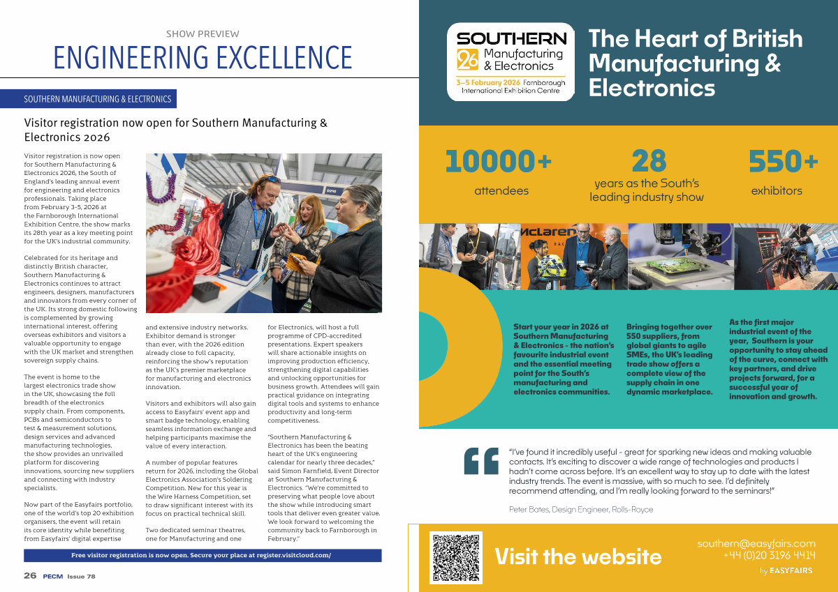 Now part of the Easyfairs portfolio, one of the world’ s top 20 exhibition organisers, the event will retain its core identity while benefiting from Easyfairs’ digital expertise and extensive industry networks. Exhibitor demand is stronger than ever, with the 2026 edition already close to full capacity, reinforcing the show’ s reputation as the UK’ s premier marketplace for manufacturing and electronics innovation.