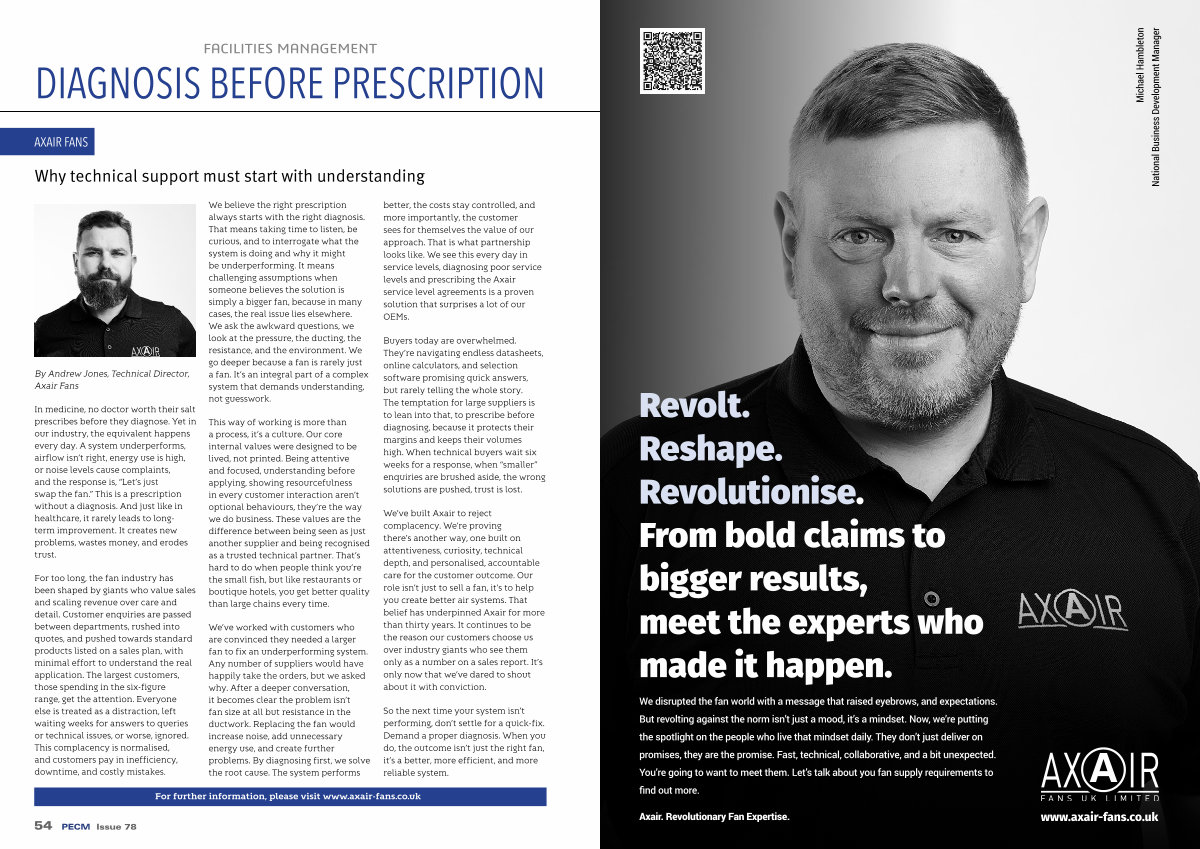 We’ ve built Axair to reject complacency. We’ re proving there’ s another way, one built on attentiveness, curiosity, technical depth, and personalised, accountable care for the customer outcome. Our role isn’ t just to sell a fan, it’ s to help you create better air systems. That belief has underpinned Axair for more than thirty years. It continues to be the reason our customers choose us over industry giants who see them only as a number on a sales report. It’ s only now that we’ ve dared to shout about it with conviction.
