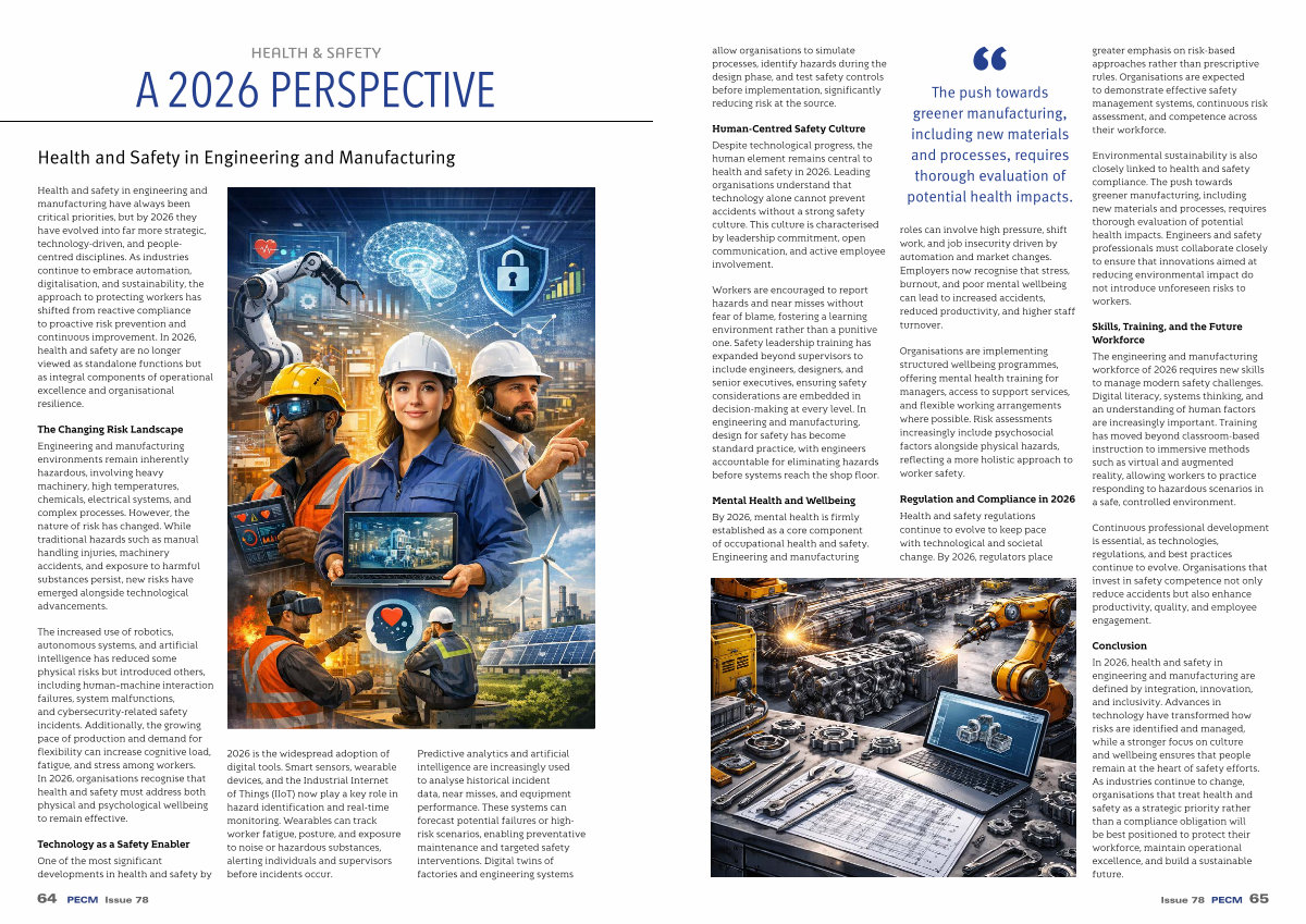 Health and safety in engineering and manufacturing have always been critical priorities, but by 2026 they have evolved into far more strategic, technology-driven, and peoplecentred disciplines. As industries continue to embrace automation, digitalisation, and sustainability, the approach to protecting workers has shifted from reactive compliance to proactive risk prevention and continuous improvement. In 2026, health and safety are no longer viewed as standalone functions but as integral components of operational excellence and organisational resilience.