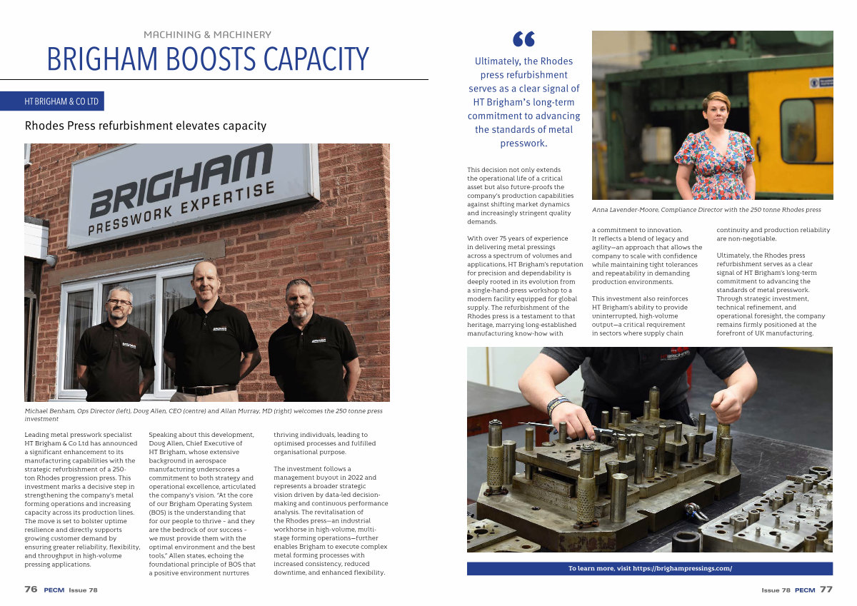 With over 75 years of experience in delivering metal pressings across a spectrum of volumes and applications, HT Brigham’ s reputation for precision and dependability is deeply rooted in its evolution from a single-hand-press workshop to a modern facility equipped for global supply. The refurbishment of the Rhodes press is a testament to that heritage, marrying long-established manufacturing know-how with
