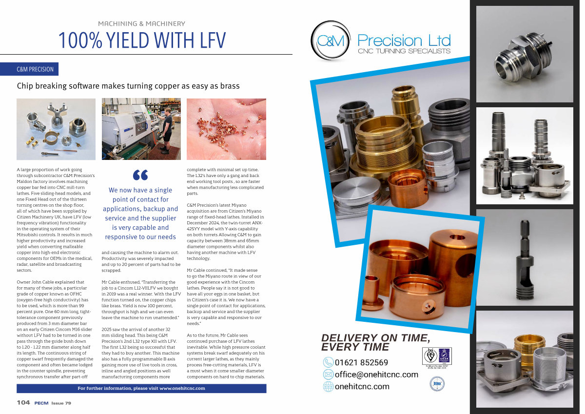 A large proportion of work going through subcontractor C & M Precision’ s Maldon factory involves machining copper bar fed into CNC mill-turn lathes. Five sliding-head models, and one Fixed Head out of the thirteen turning centres on the shop floor, all of which have been supplied by Citizen Machinery UK, have LFV( low frequency vibration) functionality in the operating system of their Mitsubishi controls. It results in much higher productivity and increased yield when converting malleable copper into high-end electronic components for OEMs in the medical, radar, satellite and broadcasting sectors.