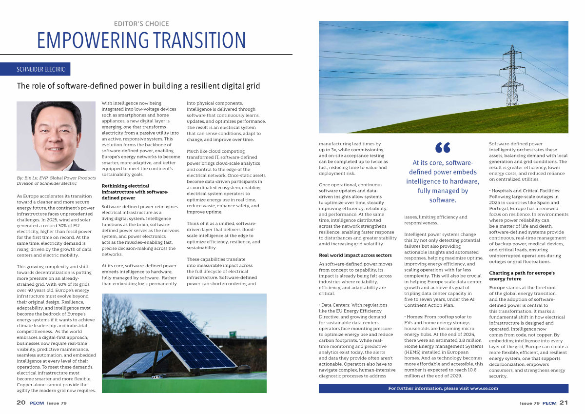 Europe stands at the forefront of the global energy transition, and the adoption of softwaredefined power is central to this transformation. It marks a fundamental shift in how electrical infrastructure is designed and operated. Intelligence now comes from code, not copper. By embedding intelligence into every layer of the grid, Europe can create a more flexible, efficient, and resilient energy system, one that supports decarbonization, empowers consumers, and strengthens energy security.