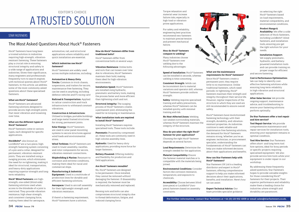 Huck ® fasteners have long been a trusted solution in industries requiring high-strength, vibrationresistant fastening. These fasteners play a crucial role in ensuring structural integrity and safety in a wide range of applications and industries. Given their significance, many engineers and professionals frequently turn to search engines with technical queries about Huck ® fasteners. In this article, we address some of the most commonly asked questions about these specialised fasteners.
