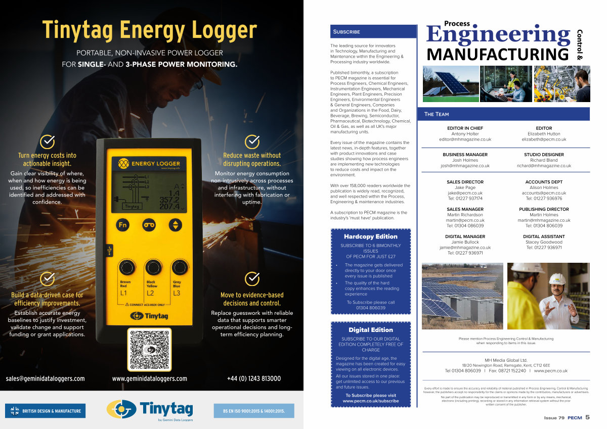Published bimonthly, a subscription to PECM magazine is essential for Process Engineers, Chemical Engineers, Instrumentation Engineers, Mechanical Engineers, Plant Engineers, Precision Engineers, Environmental Engineers & General Engineers, Companies and Organizations in the Food, Dairy, Beverage, Brewing, Semiconductor, Pharmaceutical, Biotechnology, Chemical, Oil & Gas, as well as all UK ' s major manufacturing units.