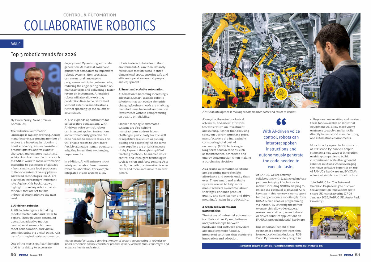 The industrial automation landscape is rapidly evolving. Across manufacturing, a growing number of sectors are investing in robotics to boost efficiency, ensure consistent product quality, address labour shortages and enhance health and safety. As robot manufacturers such as FANUC work to make automation accessible to businesses of all sizes – from small-scale food producers to tier-one automotive suppliers – advanced technologies like AI are playing an increasingly important role. Against this backdrop, we highlight three key robotic trends for 2026 that are set to take industrial automation to the next level … deployment. By assisting with code generation, AI makes it easier and quicker for companies to implement robotic systems. Non-specialists can use natural language to programme robots to perform tasks, reducing the engineering burden on manufacturers and delivering a faster return on investment. AI-enabled robots will also allow existing production lines to be retrofitted without extensive modifications, further speeding up the rollout of automation.