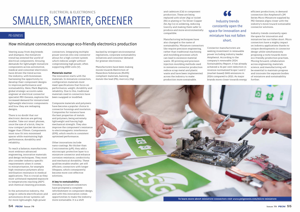 A key to sustainability Trending miniature connectors have prompted a complete refurbishment in component design, and with this innovation comes opportunities to make the industry more sustainable. It is a shift backed by stringent environmental regulations, corporate sustainability initiatives and consumer demand for greener electronics.