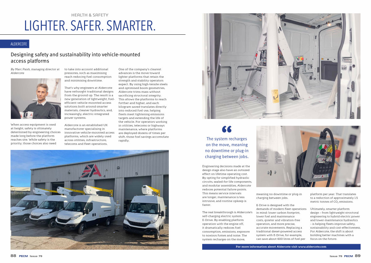 That’ s why engineers at Aldercote have rethought traditional designs from the ground up. The result is a new generation of lightweight, fuelefficient vehicle-mounted access solutions built around smarter materials, cleaner hydraulics, and, increasingly, electric-integrated power systems.